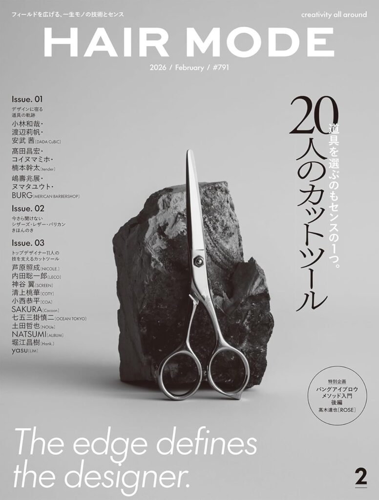 月刊『ヘアモード 2026年2月号』は、「切る」という美容師の原点に立ち返り、技術とセンスを支える“道具”にフォーカスした一冊。20人のヘアデザイナーが愛用するカットツールを通して、仕事道具に宿る哲学や美意識を掘り下げます。シザーズ・レザー・バリカンの基礎解説から、トップデザイナー11人のリアルなツール選び、特別企画「バングアイブロウメソッド」まで内容も充実。技術を磨き続けたい美容師にとって、一生モノの感性を育てるヒントが詰まった号です